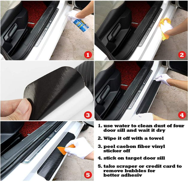 Le protecteur de seuil de porte est fabriqué en fibre de carbone noire avec une excellente résistance à l'usure et à l'eau, ce qui assure une protection efficace et durable du seuil de porte de votre voiture. Autocollants universels de protection de seuil de porte. Vous pouvez également couper la longueur appropriée dans sa taille pour correspondre au seuil de porte de votre véhicule. Pas facile de s'estomper et de se fissurer. Avec un adhésif puissant à l'arrière, il est si pratique à installer. De plus, un adhésif puissant les soutient pour tenir durablement, ils peuvent bien fonctionner même par temps de pluie, de lavage de voiture ou par temps chaud. Facile à installer aucun perçage ni soudure nécessaire, aucun dommage à votre véhicule.