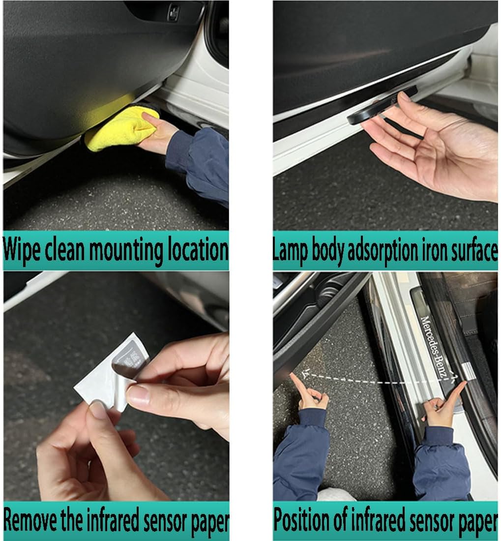 4. Installation facile : Améliorez votre expérience de conduite grâce à nos éclairages de portières qui se collent facilement à l'intérieur des portières, sans perçage. Fixation sécurisée et stable grâce à l'adhésif double face, sans câblage.