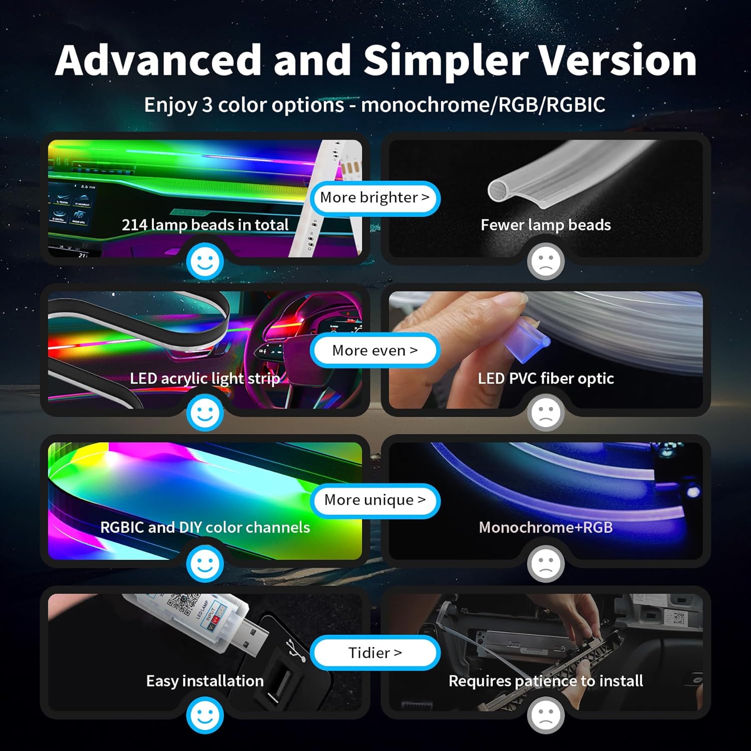 - 🚲 Propre et Facile à Installer: Ouvrez simplement un espace dans le tableau de bord, insérez la bande en acrylique dans le tableau de bord, puis fixez l'éclairage des pieds. Appuyez une fois sur le bouton USB pour sélectionner la couleur et appuyez longuement 1 à 2 fois pour allumer/éteindre. L'éclairage d'ambiance voiture dispose également d'une fonction mémoire. Convient aux camping-cars, voitures, camions, SUV, etc. Également utilisé pour l'intérieur, les néons, les lumières de yacht, etc.
