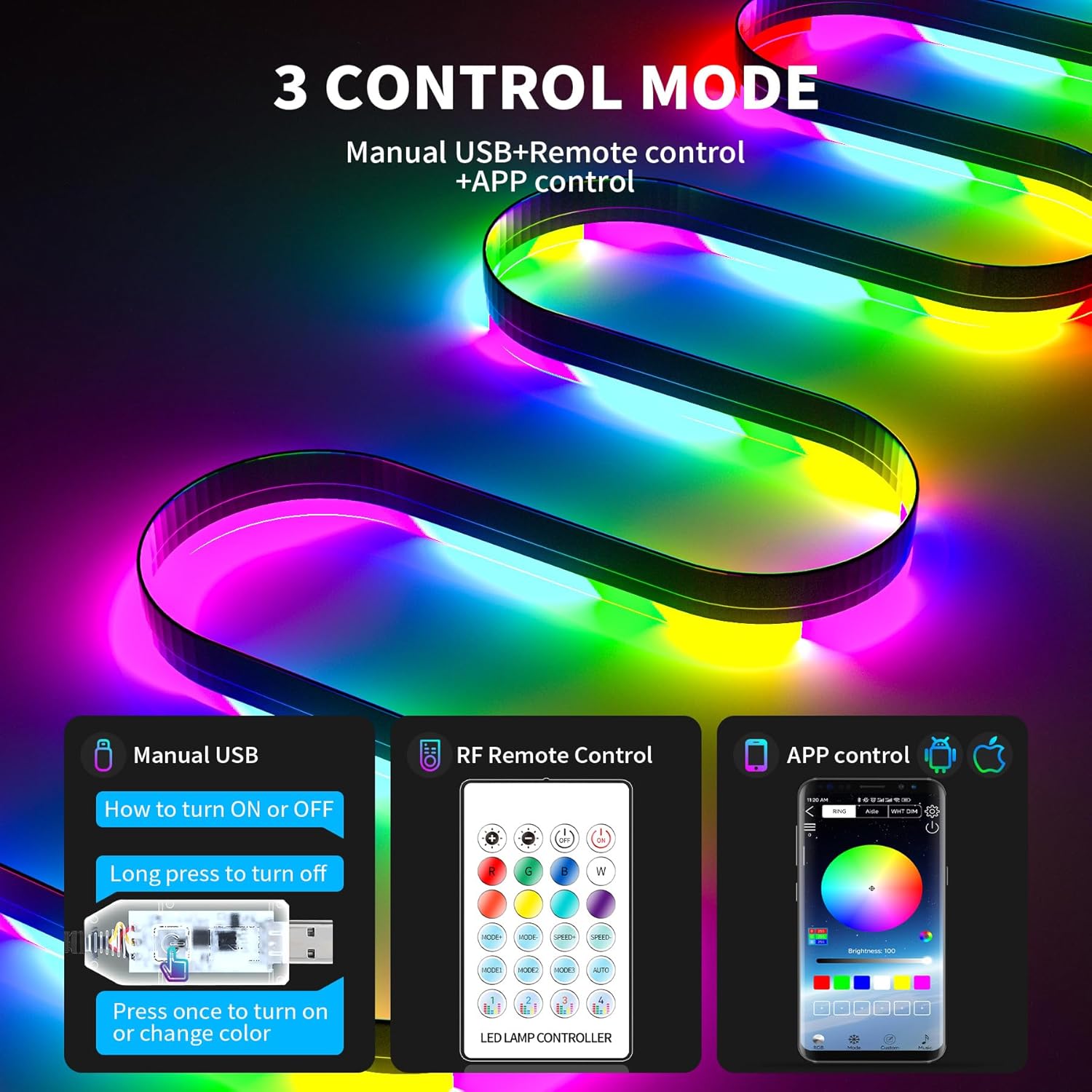- 🛵3 Méthodes de Contrôle: Application + télécommande + bouton USB manuel. Après vous être connecté à votre smartphone via Bluetooth, vous pouvez régler la couleur (16 millions de couleurs), la luminosité (0 %-100 %), la vitesse (0 %-100 %), la synchronisation, la musique, 255 commandes vocales et 210 modes LED via le APP. La éclairage intérieur voiture USB convient aux systèmes iOS et Android.