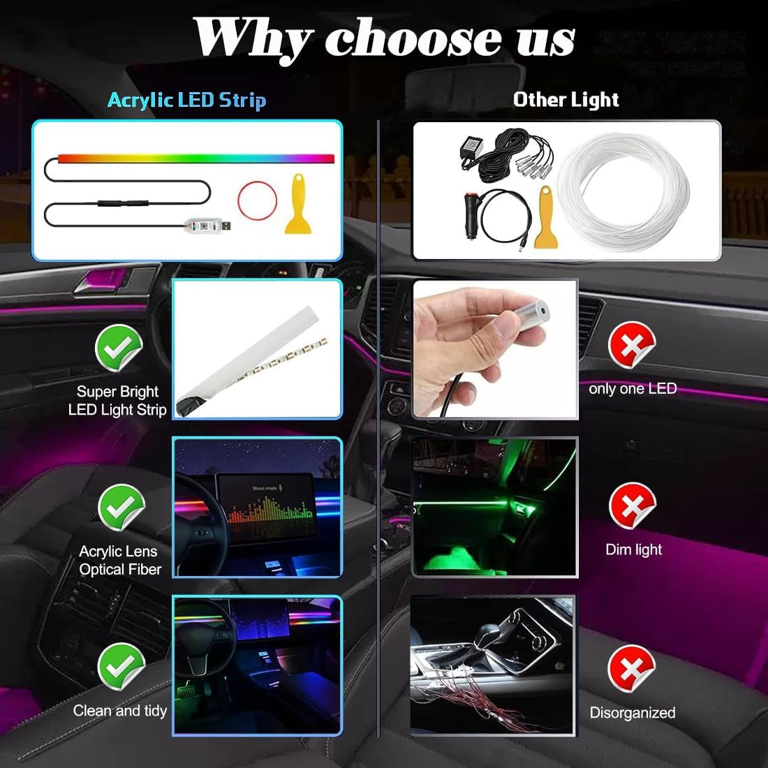 - Large gamme d'utilisation:La barre d'éclairage intérieur voiture comprend 1 paire bandes lumineuses en fibre optique acrylique 43,3 pouces/110CM.La barre d'éclairage acrylique peut être pliée et coupée librement,vous pouvez bricoler pour l'adapter à votre véhicule.Convient à la voiture,au camion,au SUV,à la voiturette golf, etc.